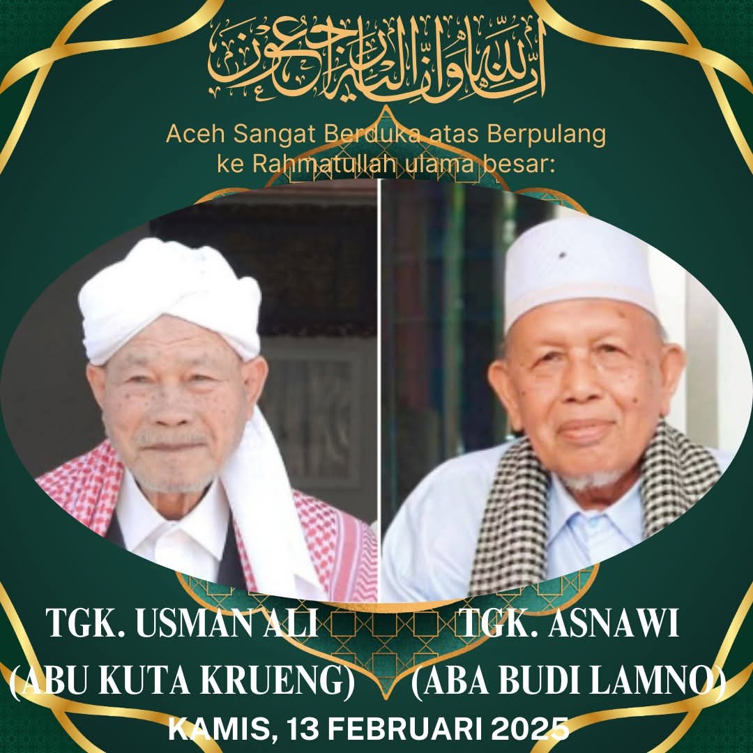 Lhokseumawe,”Aceh Berduka,” Pelita Umat Padam, Pemko Lhokseumwe melalui Dinas Syariat Islam Dan Pendidikan Dayah Kota Lhokseumawe Mengucapkan Inna lillahi wainna ilaihi raji’un atas meninggalnya dua ulama kharismatik Aceh di hari yang bersamaan waktu yang berbeda ujar Drs. Tgk. H. Ikhwansyah, MA Kamis 14/02/2025.