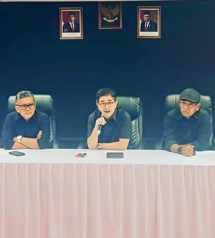 KETUA TPN Ganjar Mahfud Arsjad Rasjid didampingi Sekjen PDIP Hasto Kristiyanto memberikan penjelasan kepada wartawan usai mengikuti rapat gabungan dengan Pimpinan Partai Koalisi Ganjar-Mahfud di Gedung High End, Menteng, Jalan Kebon Sirih, Jakarta Pusat, Rabu (8/11/2023). Arsjad menyampaikan keprihatinannya terhadap kontradiksi keputusan MKMK. (FOTO : AWE/HI)