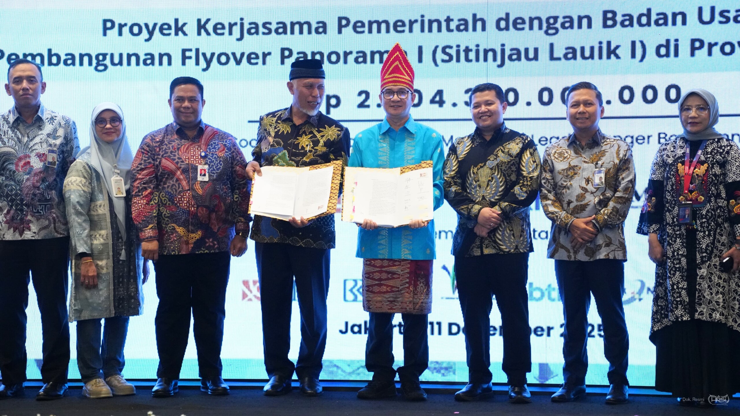 Acara penandatanganan yang dihadiri Gubernur Sumbar H Mahyeldi Ansharullah, antara Direktur Utama PT Hutama Panorama Sitinjau Lauik (PTHPSL) Michael Arthur Paulus Rumenser dengan lembaga penjamin dan pembiaya proyek jalan dan jembatan Sitinjau Lauik.