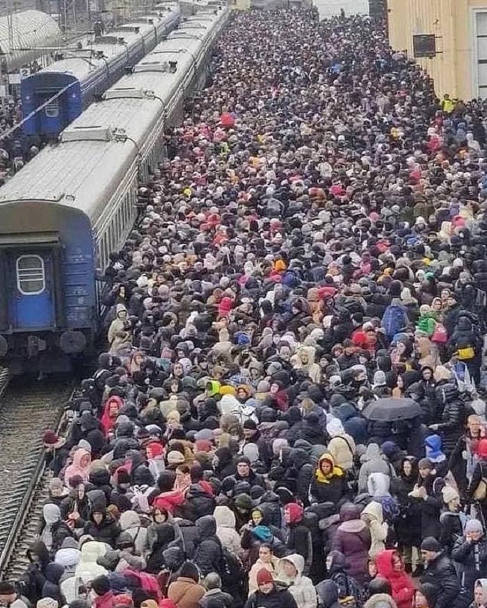 Ukraina, Terjepit bersama di peron kereta api, lautan tragedi manusia tampak membentang sejauh mata memandang di Stasiun Kereta Kharkiv.