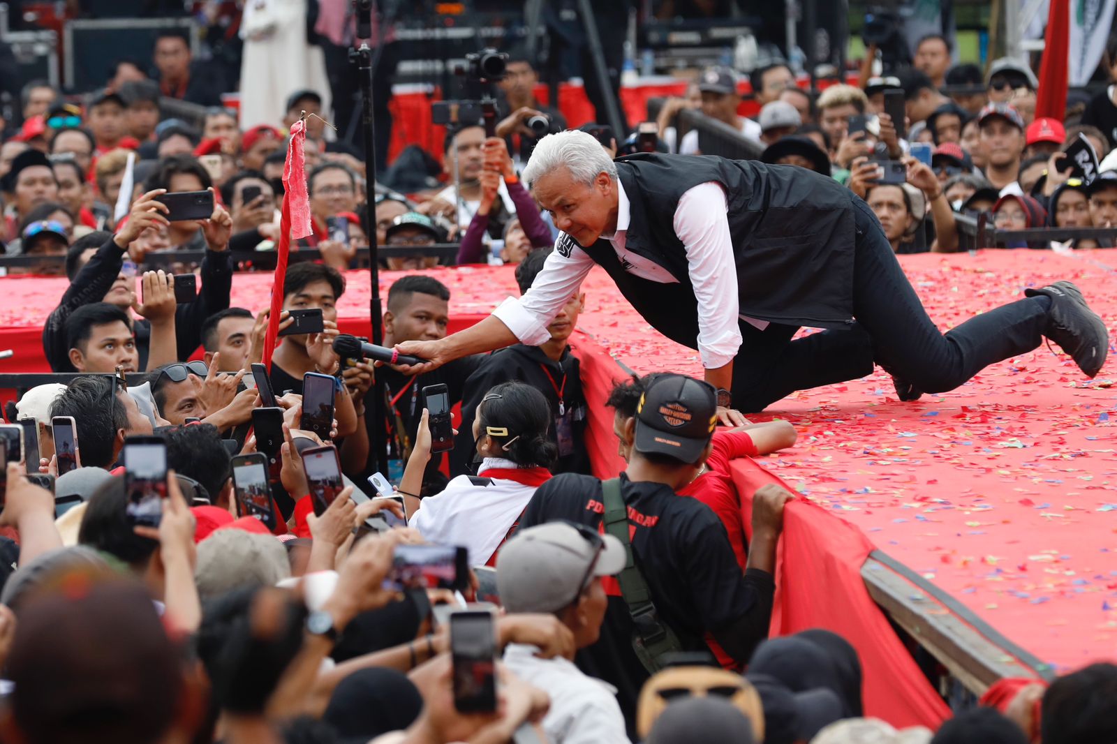 Warga yang memadati lokasi acara berusaha menyalami Ganjar di sepanjang jalan menuju panggung kampanye diiringi musik tradisional. Mendekati panggung kampanye, Ganjar dikalungi rangkaian bunga.
