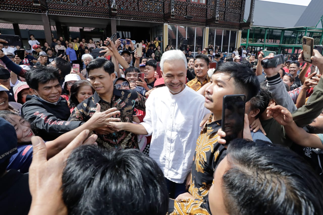 SALAMAN – Warga Toraja berlomba bersalaman dengan Capres Ganjar Pranowo sesaat memasuki tempat pertemuan dengan tokoh dan masyarakat Toraja Utara, Sabtu (25/11). (Foto : media centre)
