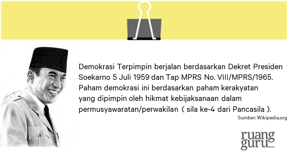 Jakarta – Sejarah Indonesia (1959-1966) adalah masa di mana sistem “Demokrasi Terpimpin” sempat berlanjut di Indonesia. Demokrasi terpimpin adalah sebuah sistem demokrasi dimana seluruh keputusan serta pemikiran berpusat pada pemimpin negara, kala itu Presiden Soekarno.
