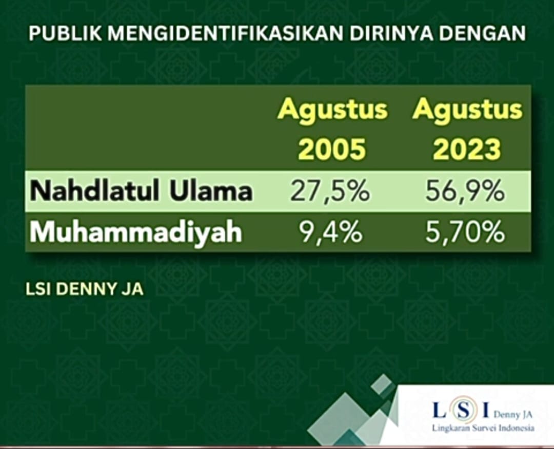 Hal ini berbeda dengan orang yang mengidentifikasi sebagai bagian dari Muhammadiyah. Pada tahun 2005, orang yang mengidentifikasi dirinya sebagai Muhammadiyah 9,4 persen, lalu pada tahun 2023 menurun menjadi 5,7 prsen.