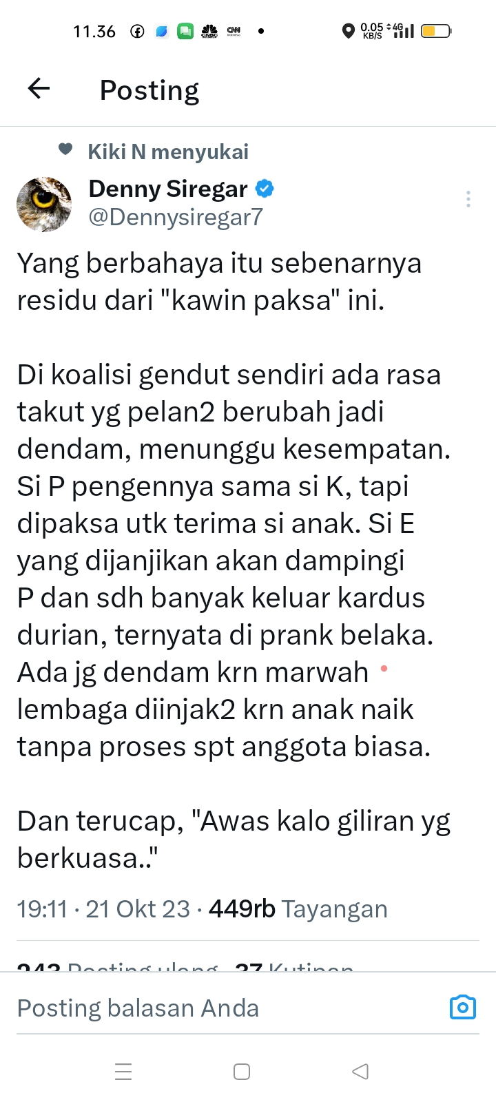 Status ini ditulis Denny melalui akun @,Dennysiregar7 pada 21 Oktober 2023 pukul 19.17 WIB dan telah ditayang ulang sampai 449 ribu kali.