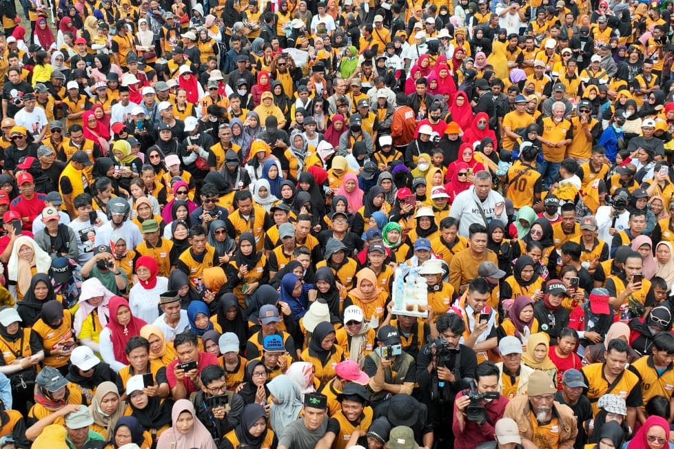 Momen Cawapres Mahfud MD dan Ketum Partai Hanura disambut lautan massa di lapangan Stadion Wiradadaha, Tasikmalaya, Jawa Barat (Jabar) Sabtu (27/1/2024) yang menjadi arena Rapat Akbar sekaligus Tasyakuran Harlah Partai Hati Nurani Rakyat (Hanura) ke-17. (Foto : TPNGM)