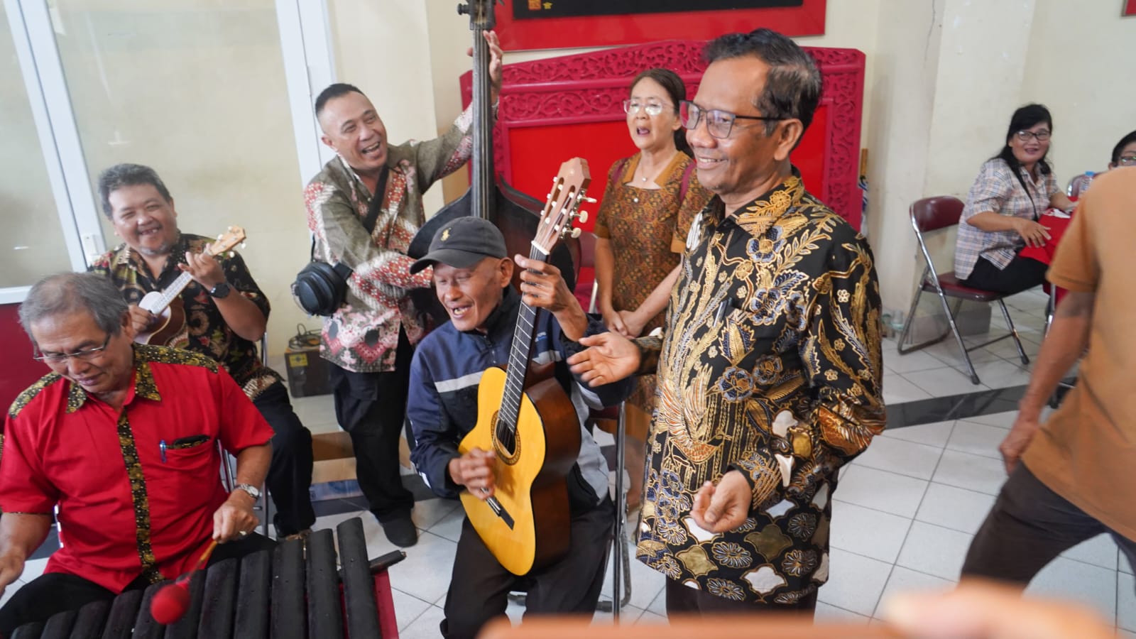 Di sana, Mahfud disambut alunan musik khas Tiongkok. Pertemuan yang berlangsung santai ini disambi ngopi bareng, makan sate dan ketupat sayur khas Padang.