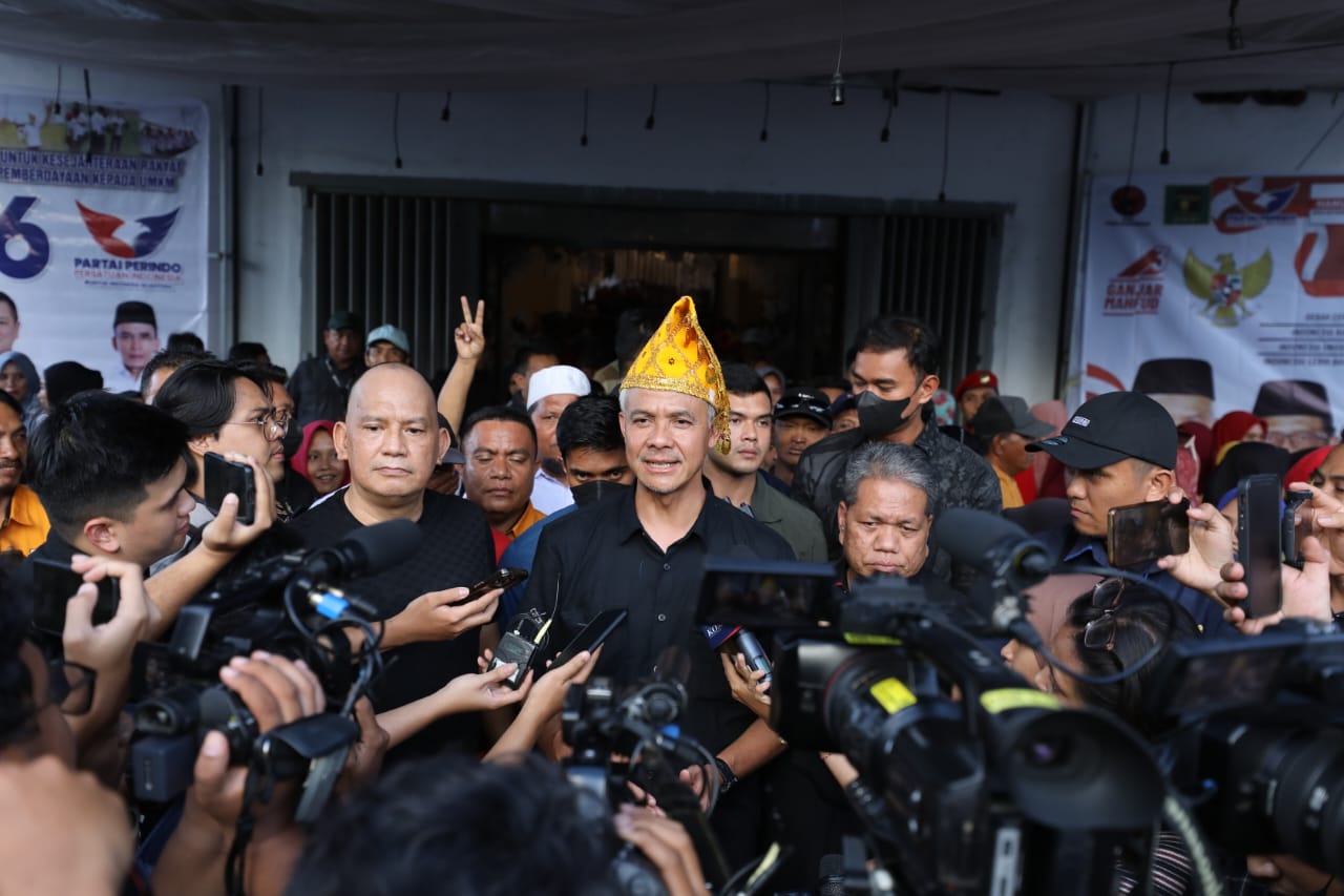 CAPRES Ganjar Pranowo memberikan penjelasan soal dukungan terhadap korban bencana gunung Marapi Sumbar, usai bersilaturahmi dengan ribuan masyarakat Donggala di Gedung Oasis, Jl. Trans Palu-Donggala, Tj. Batu, Kec. Banawa, Kabupaten Donggala, Senin (4/12/2023). (Foto : media centre TPNGM)