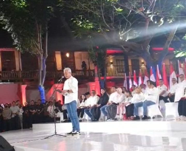 Didampingi sang Cawapres Mahfud MD, Ganjar Pranowo mengawali sambutannya dengan mengatakan bahwa ikhtiar memenangkan bukan hanya untuk Paslon dan partai pendukung tetapi sejatinya ditujukan untuk kemenangan bangsa Indonesia.