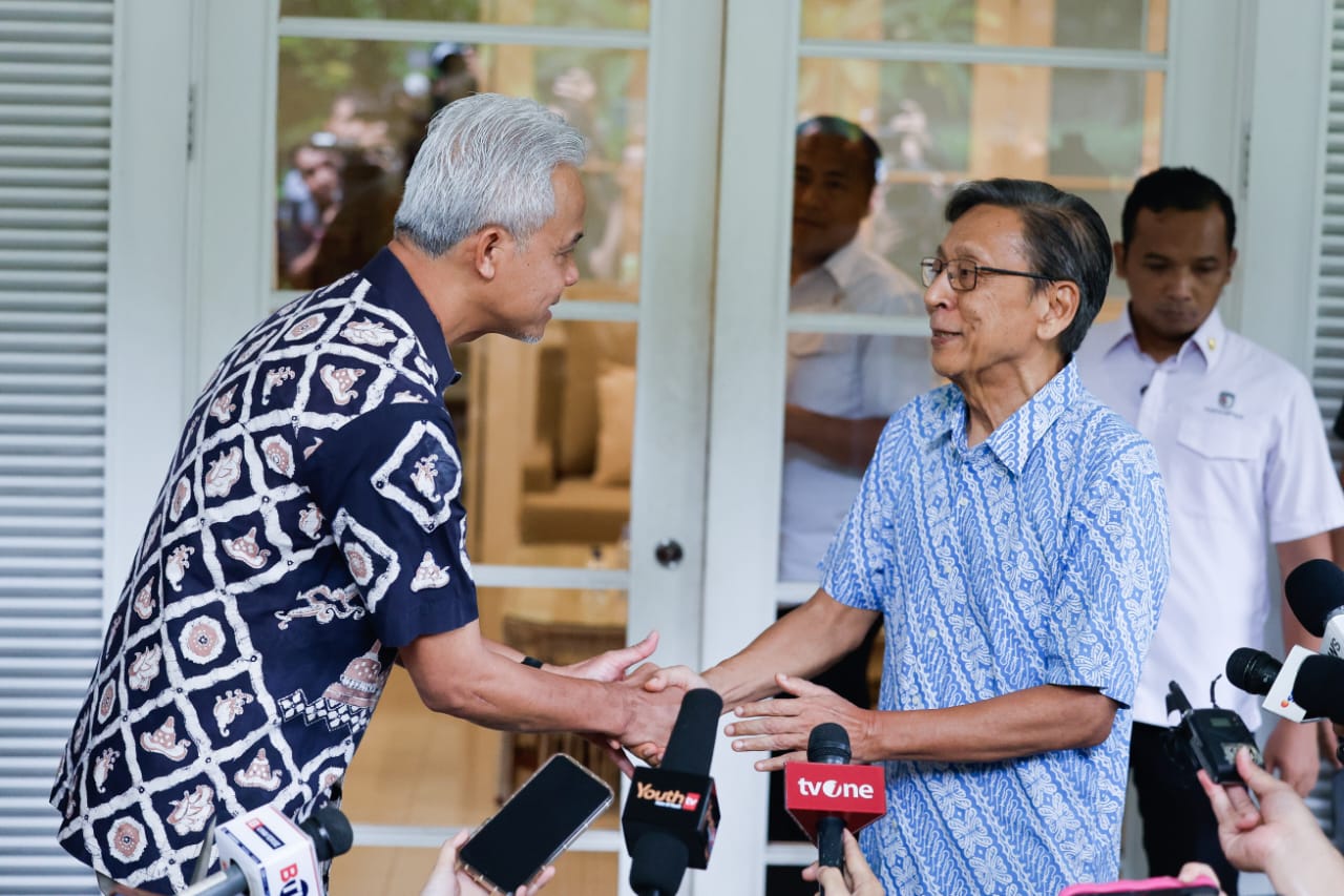 Capres Ganjar Pranowo menemui mantan Cawapres Boediono ke kediamannya Jalan Jambu Nomor 11, Menteng, Jakarta Pusat, Jumat (24/11/2023). Saat bertemu Boediono, Ganjar mengaku banyak mendapatkan pelajaran penting tentang pengelolaan negara. (Foto : media centre TPN GAMA)