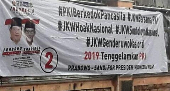 Selain foto Prabowo – Sandiaga Uno, terdapat pula tulisan seperti “PKI berkedok Pancasila”; “JKW Bersama PKI”; “JKW Hoaks Nasional”; “JKW Sontoloyo Nasional”; “JKW Genderuwo Nasional”; “2019 Tenggelamkan PKI”; dan, paling bawah terdapat tulisan”Prabowo – Sandi for Presiden Indonesia Kuat”.(Doddy Frayudi)