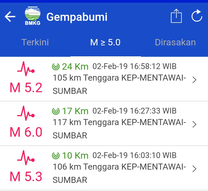 Dari BMKG bisa dilihat, gempa terakhir terjadi dengan Mag:5.2, 02-Feb-19 16:58:12 WIB, Lok:2.88 LS,99.96 BT (105 km Tenggara KEP-MENTAWAI-SUMBAR).