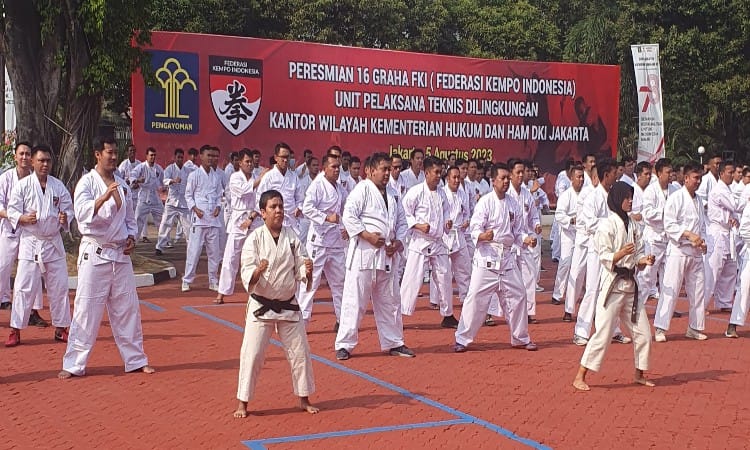 Di tengah kerja sama ini, ratusan ASN di lingkungan Kemenkumham DKI Jakarta dengan berseragam atlet Kempo berwarna putih dengan mayoritas sabuk putih mendemontsrasikan gerakan bela diri dimpimpin senior bersabuk hitam.