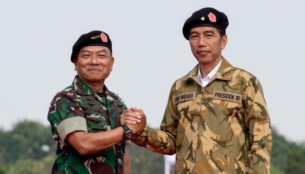 Presiden Joko Widodo (kanan) berjabat tanagn dengan Panglima TNI Jenderal TNI Moeldoko (kiri) seusai menerima pengangkatan sebagai Warga Kehormatan Pasukan Khusus TNI di Lapangan Merah Plaza, Mabes TNI, Cilangkap, Jakarta, 16 April 2015. ANTARA/