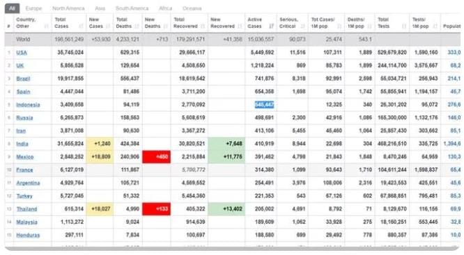 Daftar negara dengan kasus aktif corona tertinggi di dunia /Worldometers