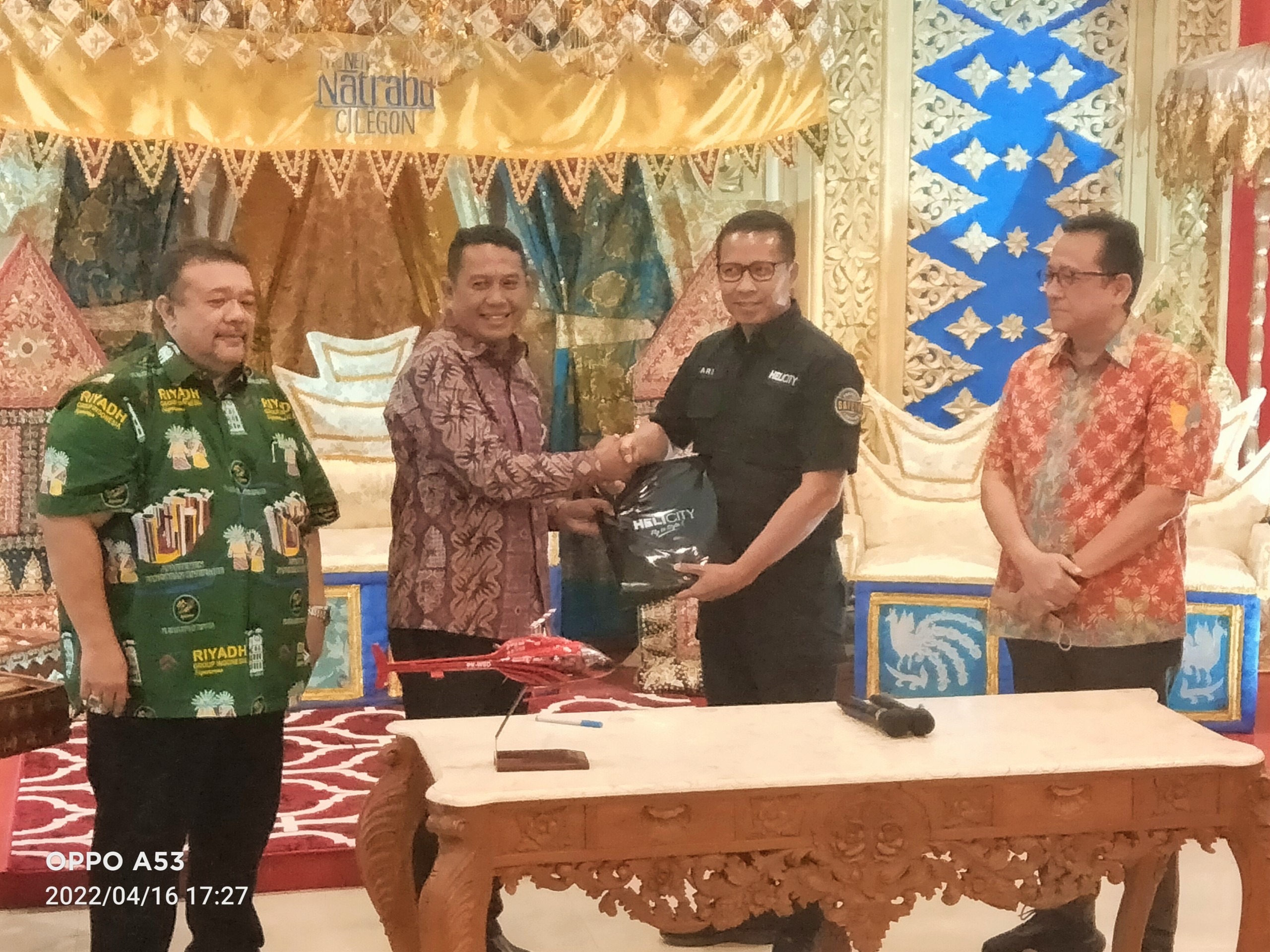 MOU – Tubagus Iman disaksikan Bally Saputra dan Irman Gusman sedang menukar naskah kerjasama pengoperasian helicity dari dan ke hotel Grand Mangku Putra Cilegon, pada soft opening restoran terbesar di dunia The New Natrabu, Sabtu (16/4). (Foto : Awe)