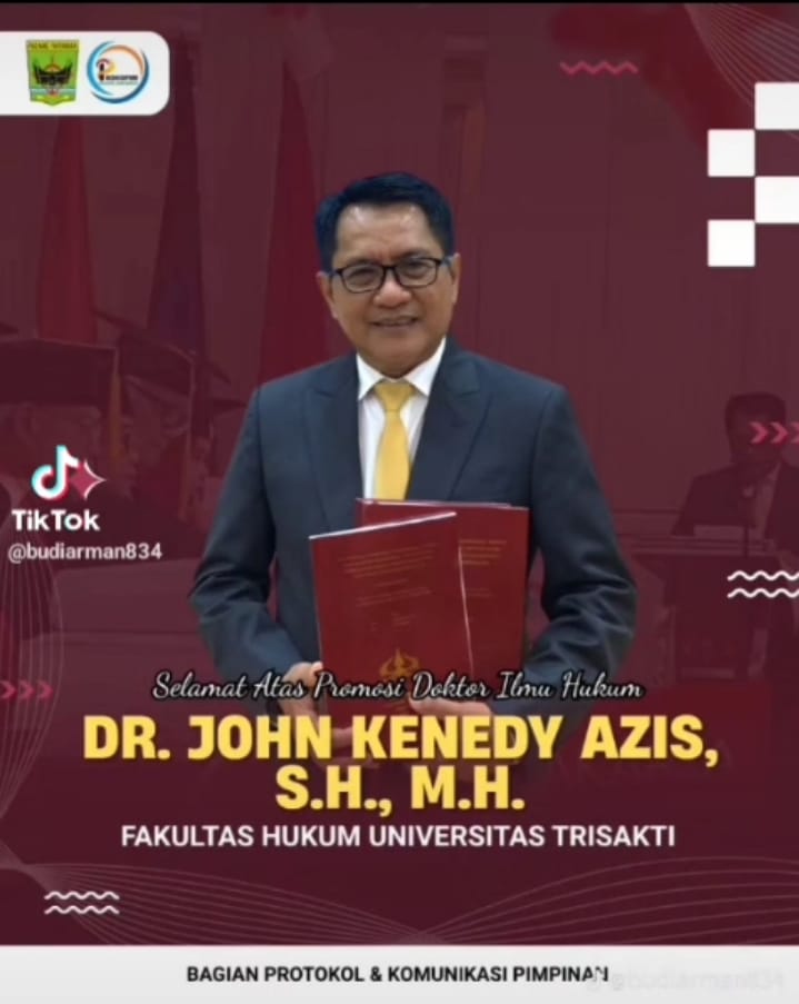 Alhamdulillah, lewat ujian disertasi Jumat (18/7) di depan Tim Penguji Doktor Hukum Univeristas Trisakti, John Kenedy Azis berhasil mempertahankan disertasinya, sekaligus mendapatkan prediket kelulusan tertinggi, cumlaude.