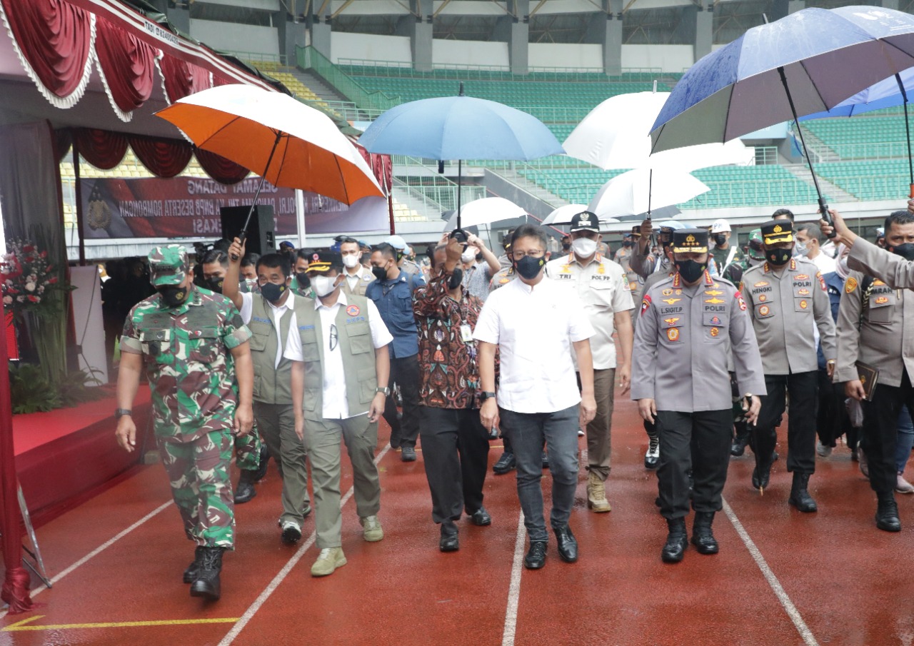 Bekasi – Kepala Badan Nasional Penanggulangan Bencana (BNPB) Letnan Jenderal TNI Suharyanto bersama Menteri Kesehatan Budi Gunadi Sadikin, Kapolri Jenderal Listyo Sigit Prabowo dan Letnan Jenderal TNI Bambang Suswantono yang mewakili Panglima TNI yang berhalangan hadir, meninjau pelaksanaan vaksinasi di Stadion Patriot Candrabhaga, Kota Bekasi, Jawa Barat, Selasa (8/2/2022).