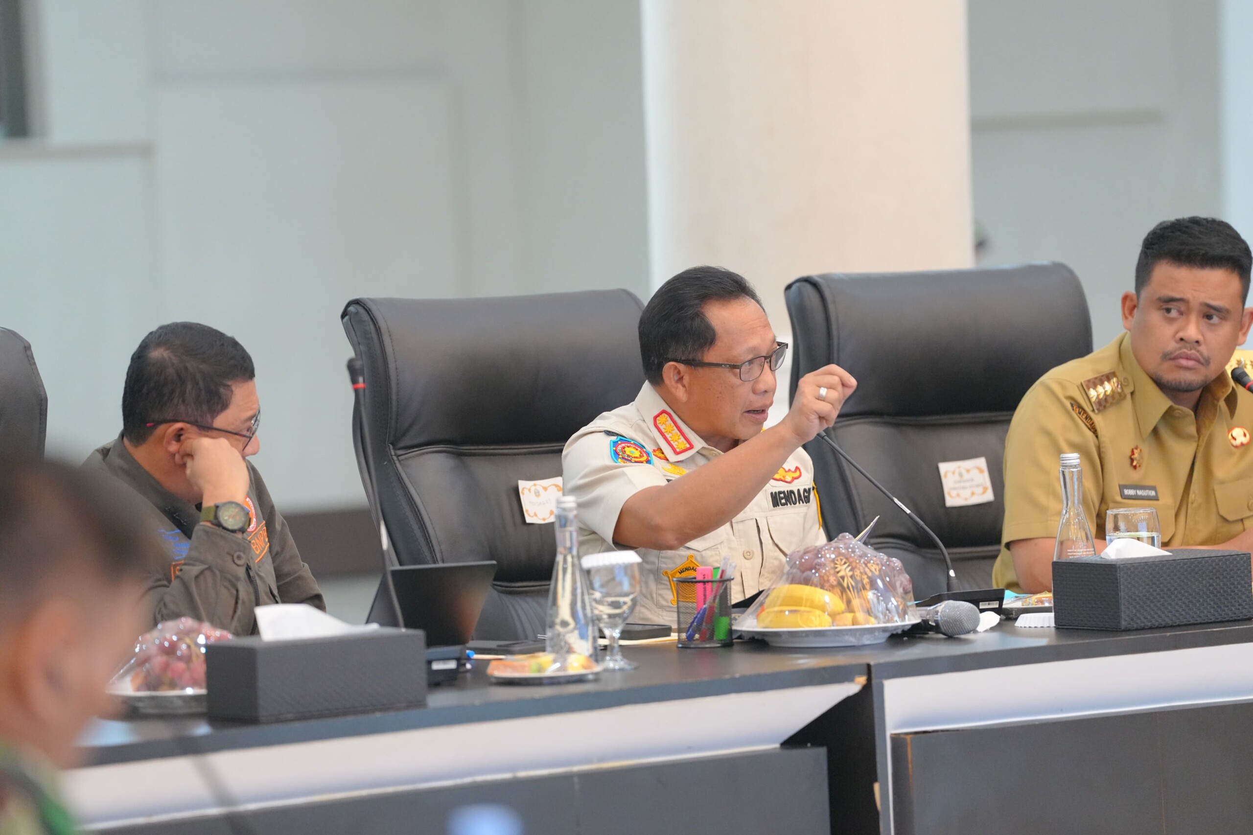 Menteri Dalam Negeri Tito Karnavian didampingi Ketua BNPB Suharyanto dan Gubernur Sumut Bobby Nasution, saat memimpin rapat kordinasi penanganan pascabencana di Aula Raja Inal Siregar, Kantor Gubernur Sumut, Kota Medan, Senin (12/1/2026). (Foto : Puspen Kemendagri/Awe/HI)