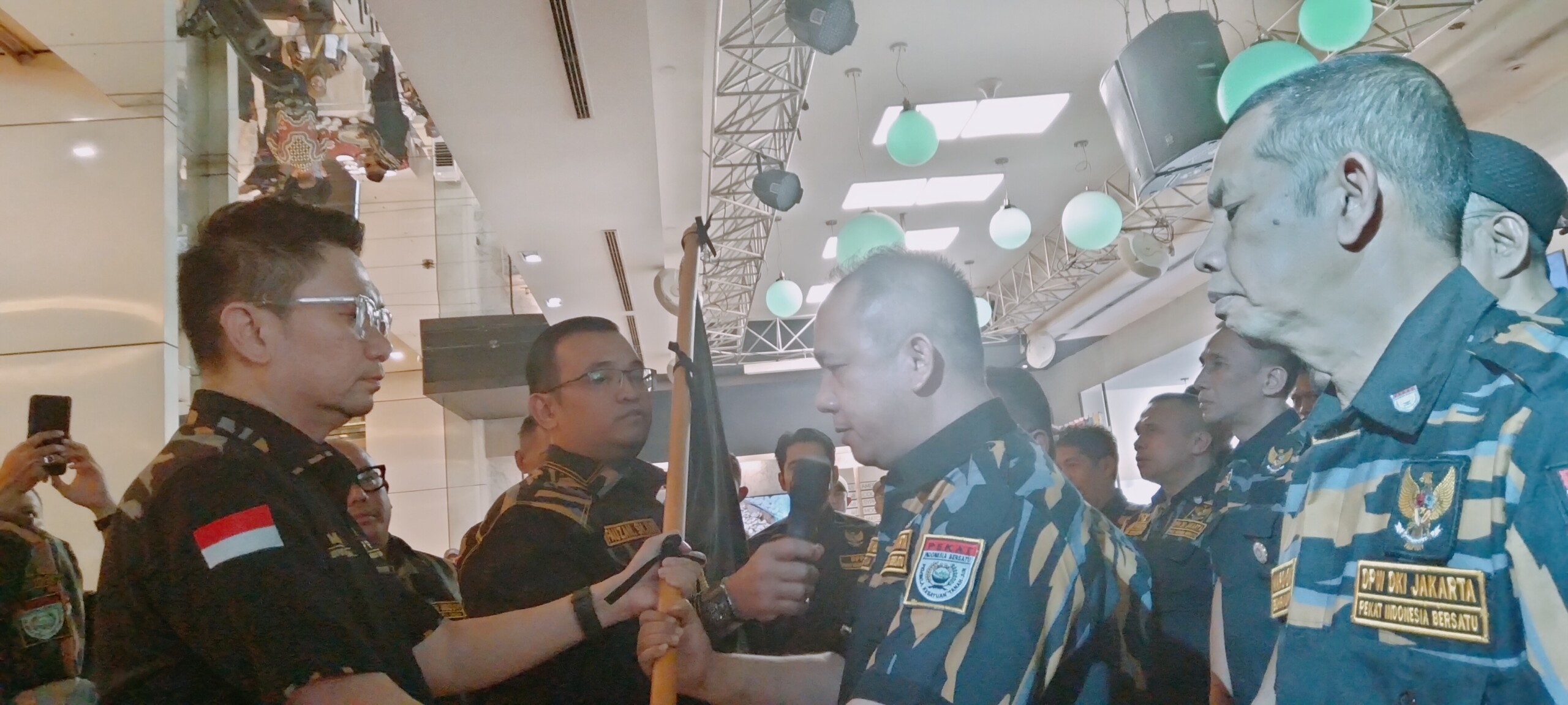 Sekjen DPP Pekat IB H Muhammad Milano SH MH menyerahkan Pataka kepada Ketua DPW Pekat IB DKI Jakarta Fendy Helfi SM, MM Tran didampingi Bendahara H Mardion SE MM bersama pengurus lain yang dilantik Sabtu (32/8/2024) di Hotel Sultan Jakarta