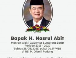 PADANG – Innalillahi Wainnailaihi rojiuun…Telah Berpulang Keramahtullah Bp.H.Nasrul Abit Bin H.Abit dini hari tgl 28 agustus Jam 01.39 dirumah sakit M Jamil dan akan dikebumikan Ba’da Zuhur hari ini Sabtu tgl 28 di Desa Labuhan Tanjak.. Kecamatan Linggo SariBaganti,Kab Pesisir Selatan…Kami atas nama Keluarga Memohonkan maaf atas Kesalahan dan Kehilapan Almarhum selama hidupnya dan Kalau ada hutang Piutang almarhum mohon hubungi kami selaku keluarganya…🙏🙏🙏🙏…Muchlis Yusuf Abit…wass