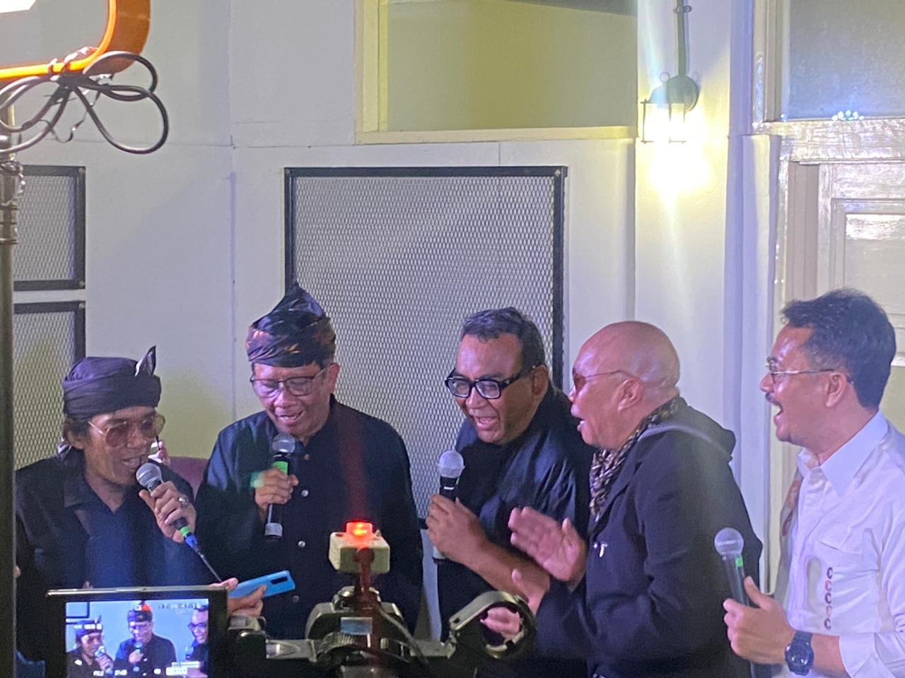 CAWAPRES Mahfud MD nyanyi bersama para seniman, budayawan dan generasi muda Bandung, Sabtu (9/12/2023). Pada kesempatan itu, Mahfud MD diberi panggilan Uwa Mahfud sebagai panggilan kehormatan. (Foto : Kiriman)