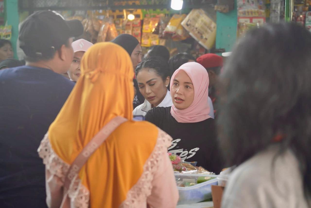 Momen Calon Ibu Negara Siti Atikoh Ganjar saat blusukan ke Pasar Oro-oro Dowo untuk mengecek beberapa harga bahan pokok bersama anggota DPRRI Krisdayanti dan Dewanti Rumpoko, Minggu (29/1/2024)