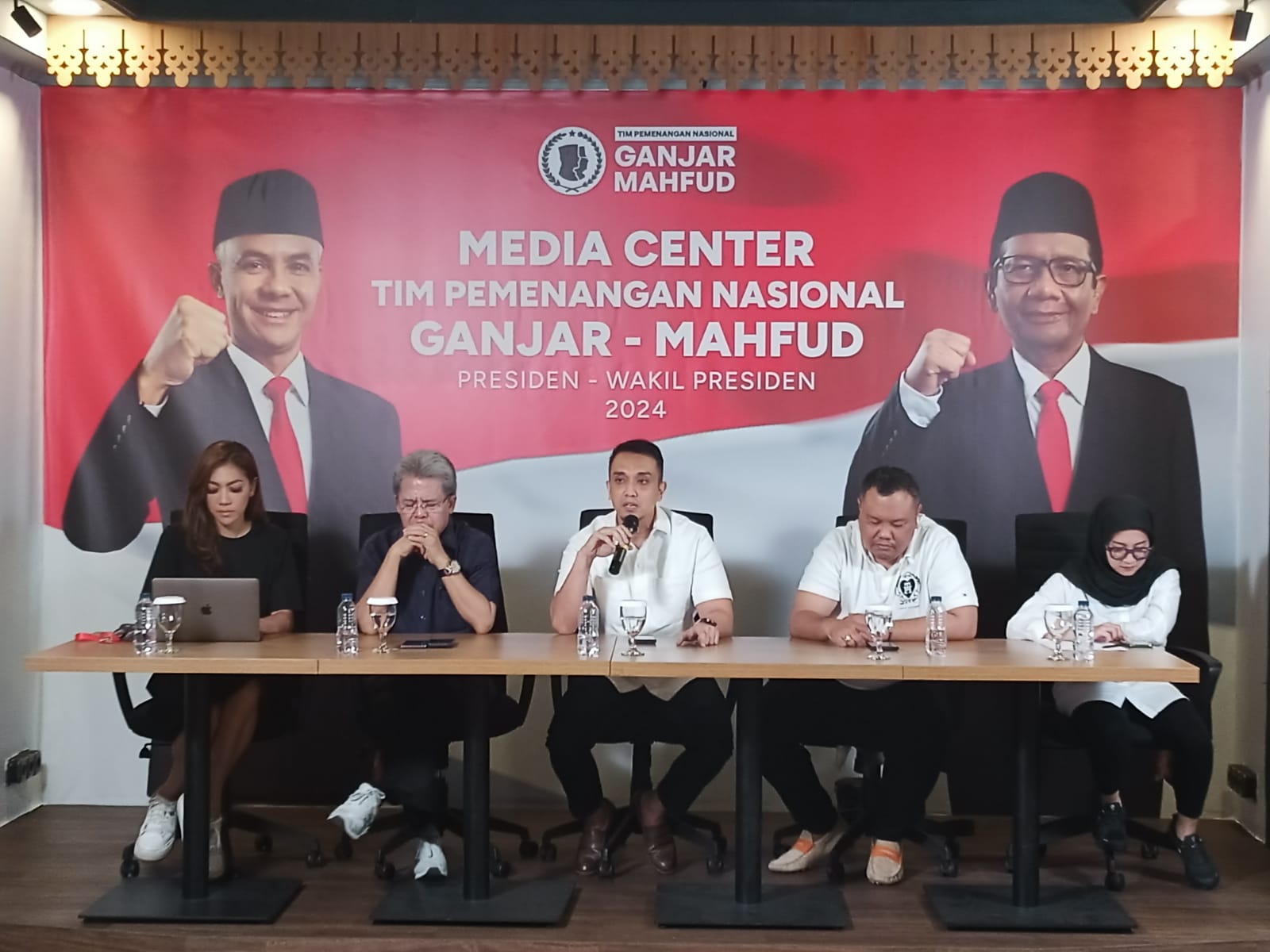 Deputi Hukum TPN Ganjar-Mahmud Dr Todung Mulya Lubis, Jubir Aiman dan Pengamat Politik Hendri Satrio memberikan penjelasan kepada wartawan di Markas Media Centre TPN Ganjar-Mahfud, Sabtu (11/11/2023. (Foto : Media Centre TPNGM)