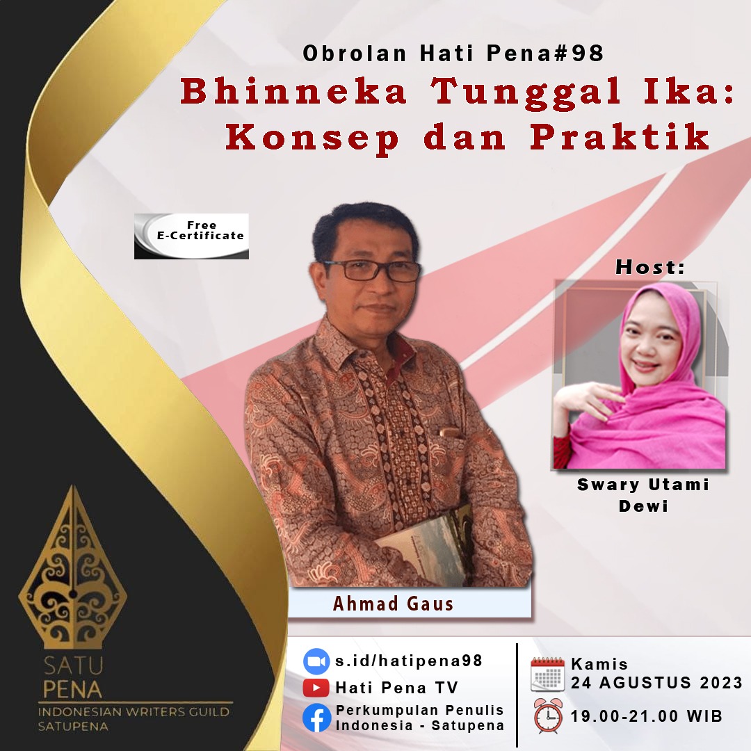 Obrolan Hati Pena #98 tentang Bhinneka Tunggal Ika itu akan berlangsung di Jakarta pada Kamis malam, 24 Agustus 2023, pukul 19.00-21.00 WIB.