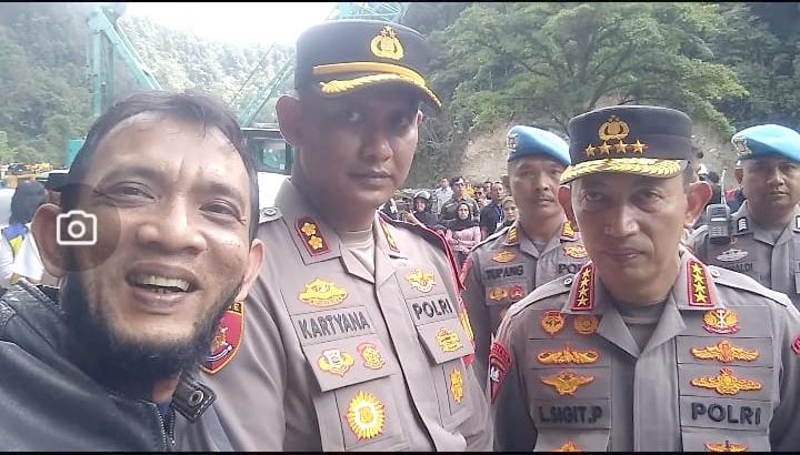 Dalam kesempatan mendampingi Presiden ke Sumbar, Kapolri Jenderal Sigit sempat foto bareng dengan Kapolresta Padang Panjang dan wartawan Karmal Putra. (Foto : Dok)