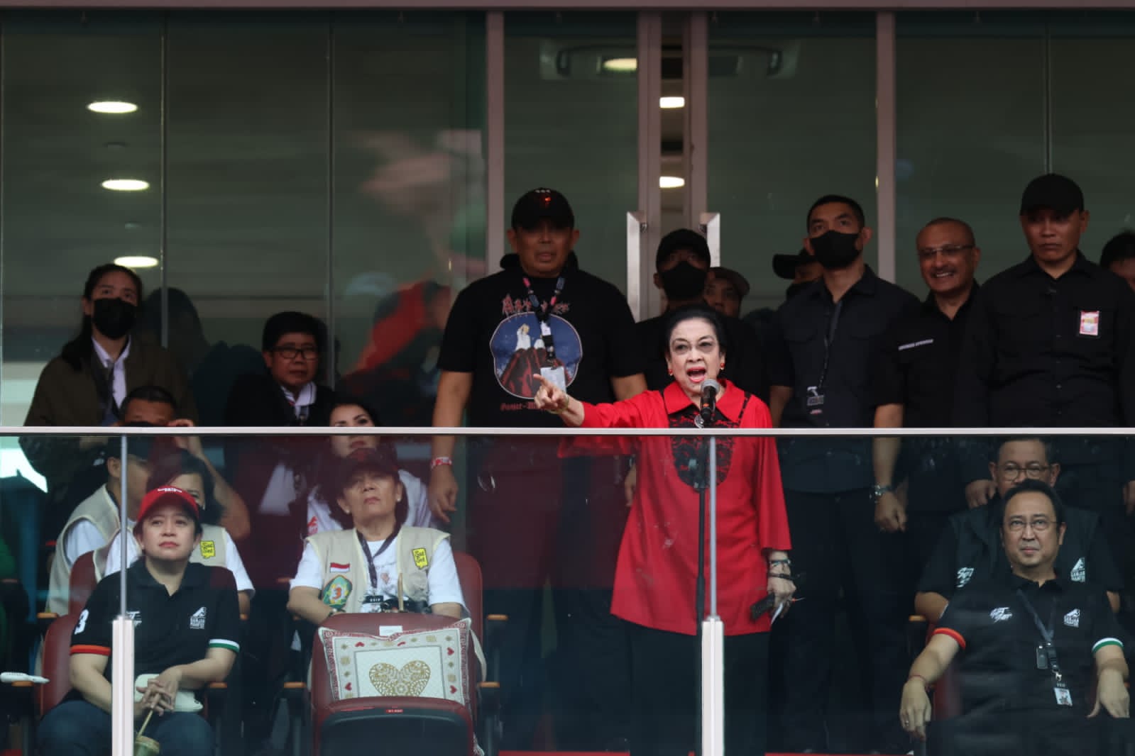 Massa memenuhi semua tempat duduk di dalam stadion dan terlihat rapat serta sesak di arena lapangan sepakbola. Warna merah, sebagai warna PDI Perjuangan mendominasi di bagian dalam dan luar stadium.