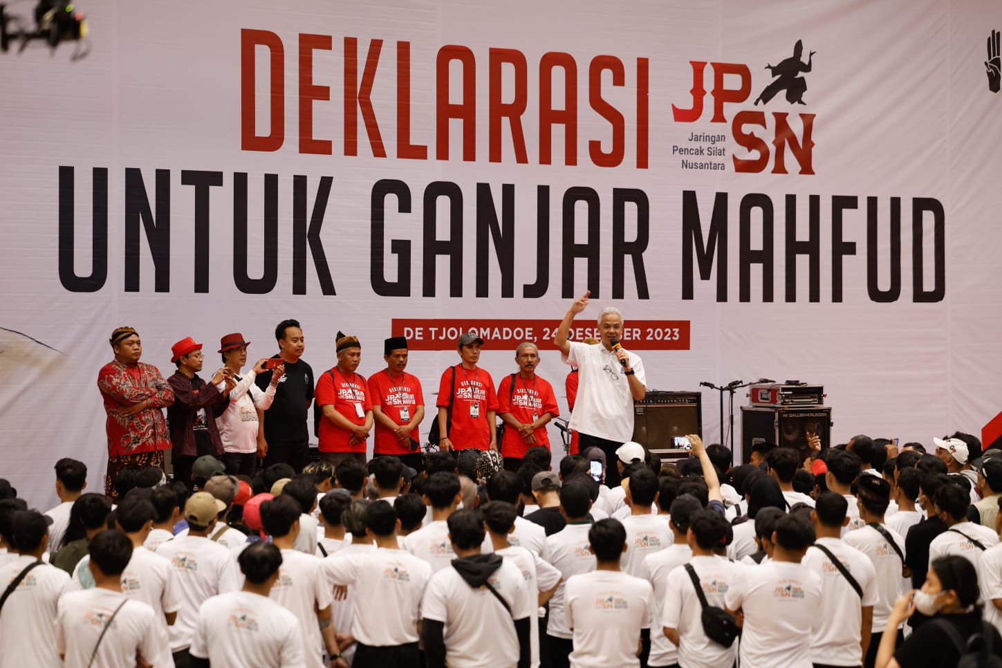 Calon Presiden RI Ganjar Pranowo menghadiri deklerasi dukungan ribuan pendekar silat untuk dirinya dan Mahfud MD pada Pilpres 2024 di De Tjolomadoe, Kecamatan Colomadu, Kabupaten Karanganyar pada Minggu (24/12/2023). Pada kesempatan itu Ganjar menyampaikan pentingnya pelestarian seni bela diri silat. (Foto : kredit TPNGM)