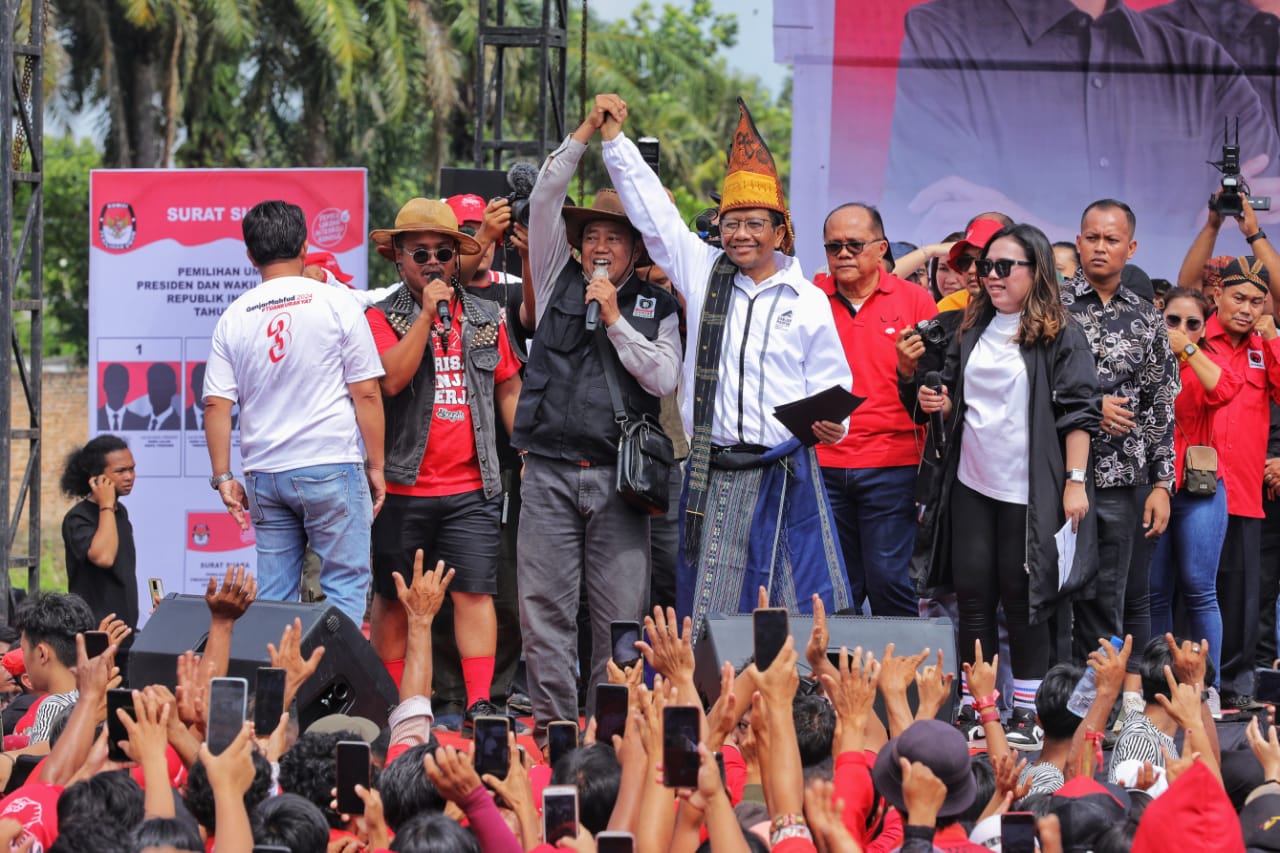 Momen Cawapres Mahfud MD menerima dukungan dari Perantau Solo Raya di Sumatera Utara saat kampanye di Lapangan Meranti Land, Kecamatan Siantar, Kabupaten Simalungun, Minggu (28/1/2024). (Foto : TPNGM)