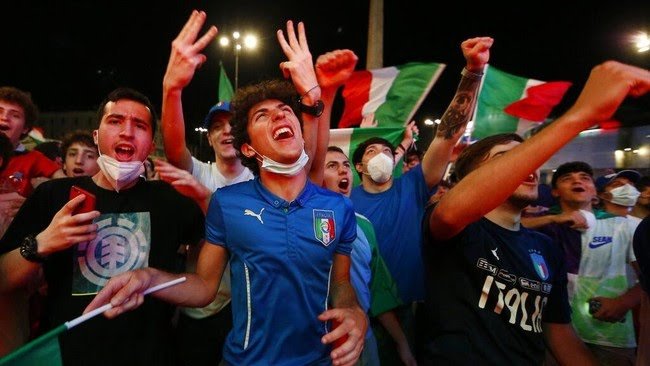 Puluhan pendukung kesebelasan Italia nonton bareng Piala Eropa tanpa jaga jarak dan masker di piazza del Popolo pusat Roma, Rabu, 16 Juni 2021. menurut data WHo tanggal 16 Juni 2021 saat ini kasus COVID-19 di dunia telah mencapai 176,5 juta kasus. Cecilia Fabiano/LaPresse via AP