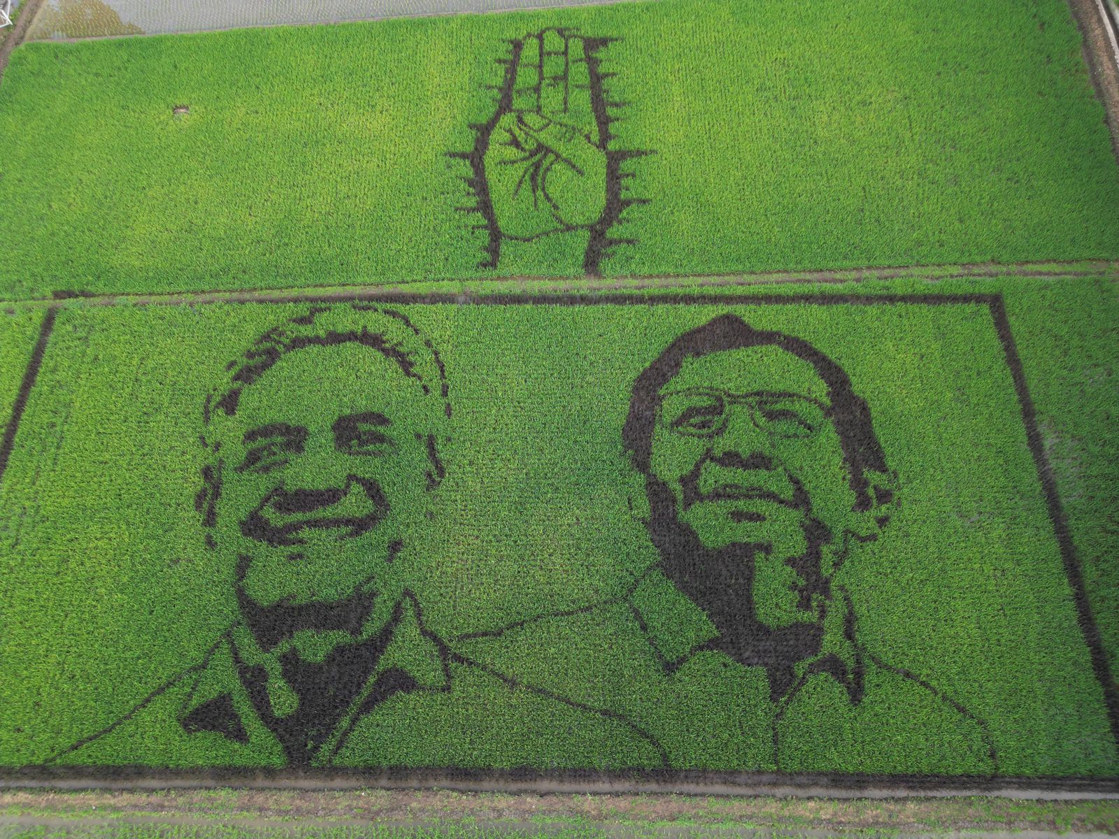 Seorang Seniman Corek menyulap sawah menjadi wajah pasangan calon Cawapres Ganjar Pranowo dan Cawapres Mahfud MD. Konon, ini dilakukan sang Seniman sebagai bentuk kecintaan terhadap Ganjar dan Mahfud.