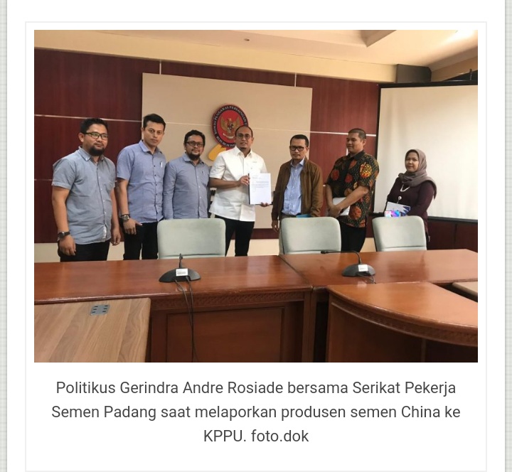 JAKARTA, harianindonesia.id – Dugaan melakukan pelanggaran dalam melakukan aktivitas perdagangan, Politikus Partai Gerindra, Andre Rosiade dan perwakilan Serikat Pekerja Semen Padang melaporkan produsen semen China, Crobch ke Komisi Pengawasan Persaingan Usaha (KPPU).