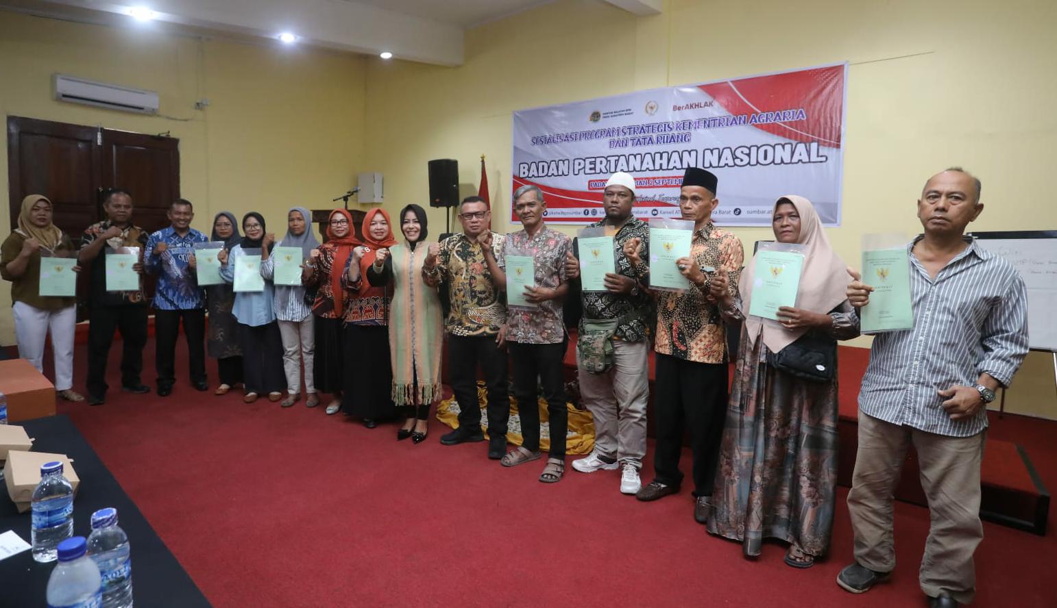 Padang Pariaman — Anggota DPR RI Rezka Oktoberia secara simbolis memberikan sertifikat gratis kepada perwakilan masyarakat di Kabupaten Padang Pariaman. Pemberian sertifikat gratis itu diberikan saat Sosialisasi Program Strategis Kementrian Agraria dan Tata Ruang yang digelar Aula Grand Buana Lestari Hotel, Ketaping, Padang Pariaman, baru – baru ini.