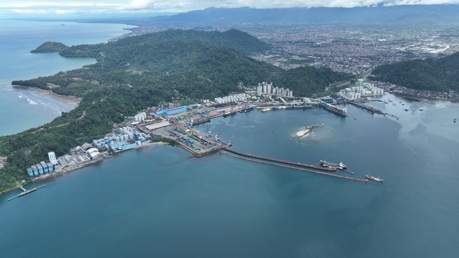 Foto udara Pelabuhan Teluk Bayur terlihat sangat cantik. Pelabuhaan yang dulu bernama Emma Havven ini, kini berubah menjadi pelabuhan total ekspor dengan komoditi andalan CPO. (FOTO : Corcom Pelindo Regional 2 Teluk Bayur)