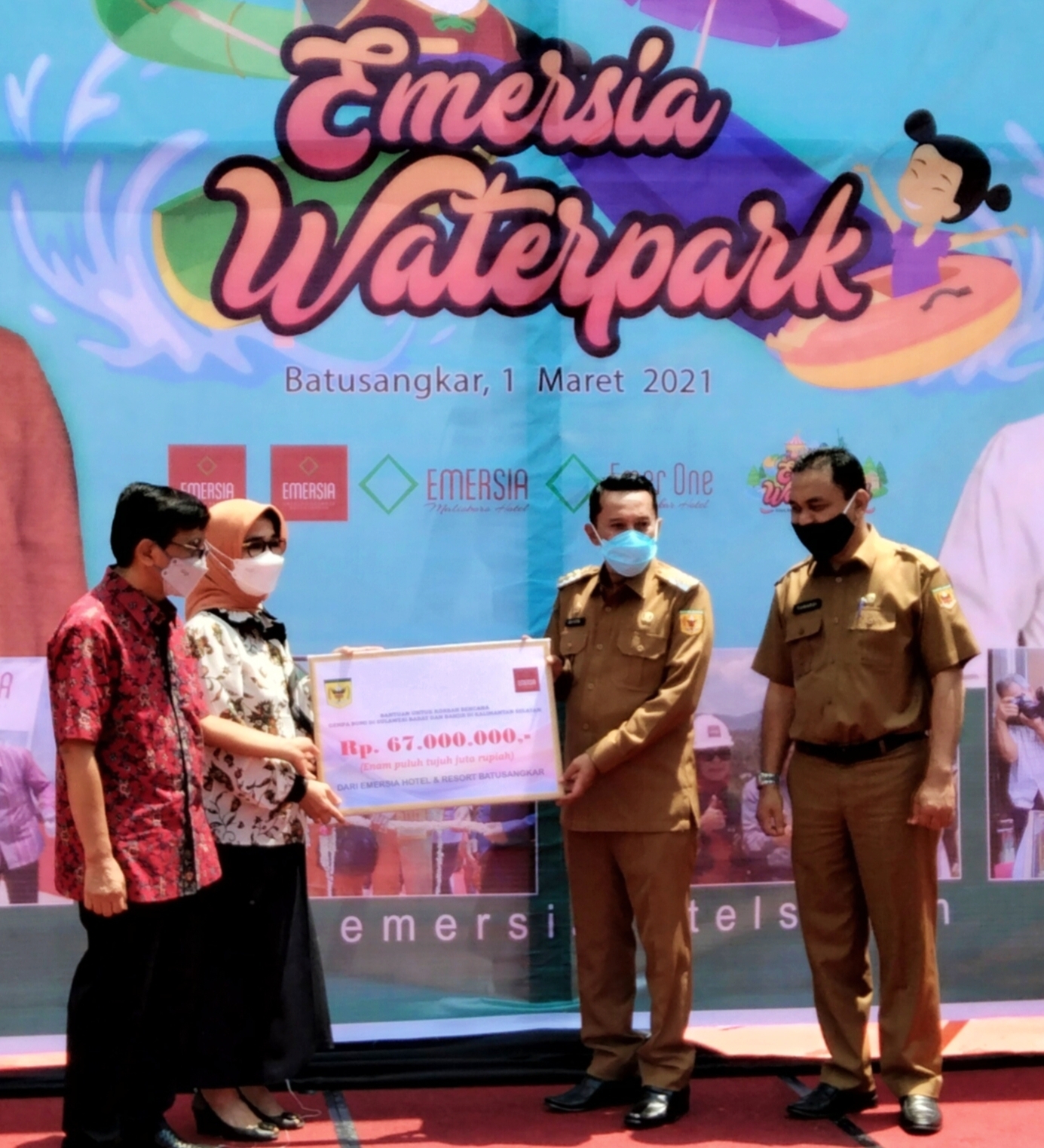 BANTUAN – Owner Emersia hotel&resort Batusangkar Mery Warti didampingi Preskom Erdy Muluk menyerahkan secara simbolis bantuan bagi korban bencana alam di Kalsel melalui Bupati Tanah Datar Eka Putra, Senin (1/3/2021) saat soft opening Waterpark Emersia Wonderland. (Foto : Awe/HI)
