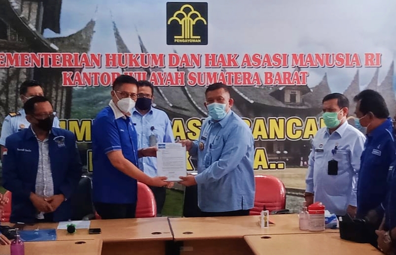 BERKAS KONGRES – Ketua DPW Partai Demokrat Sumbar Mulyadi menyerahkan berkas hasil Kongres V yang memilih AHY sebagai Ketua Umum DPP Demokrat kepada Kakanwil Kumham Sumbar Andhika Prasetya, Senin (22/3/2021)