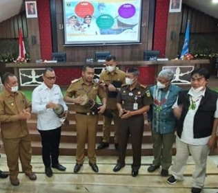 Wagub Sumbar Audy Joinaldy memainkan alat musik tradisional Mentawai pada pembukaan Rakor Kepariwisataan di Aula Bapeda Mentawai, Selasa (23/3/2021).