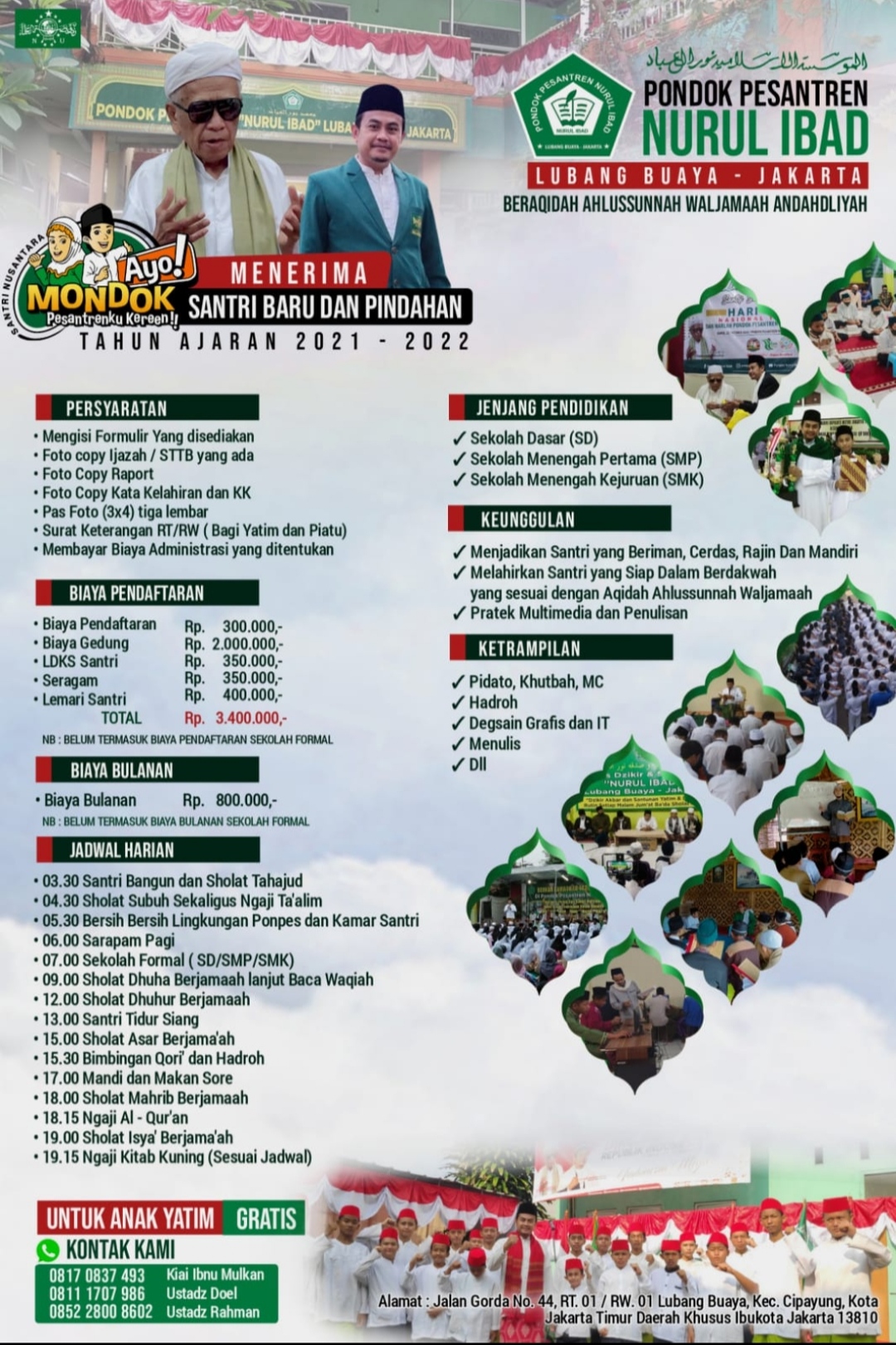 Dalam brosur Ayo Mondok yang diterima media ini, tertulis persyaratan, jadwal harian, jenjang pendidikan, keunggulan dan ketrampilanketrampilan untuk tahun ajaran 2021- 2022.