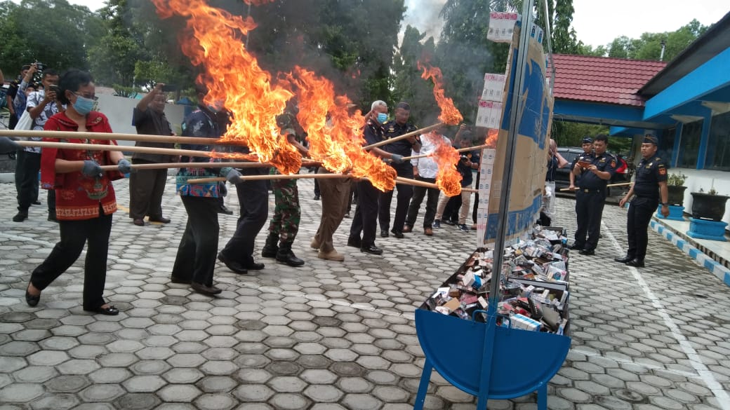 “Ratusan ribu batang lebih rokok ilegal yang kami musnahkan ini modusnya, tidak dilekati pita cukai, dilekati pita cukai palsu dan dilekati pita cukai kadaluarsa,” kata Kepala Kantor Pengawasan dan Pelayanan Bea dan Cukai Tipe Madya Pabean C (KPPBC TMP C ) Indra Sucahyo.