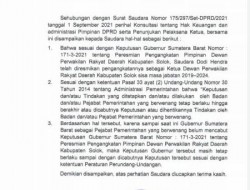 Surat ini Sekdaprof Sumbar ini muncul sebagai jawaban atas pertanyaan Sekwan DPRD Solok tentang hak administrasi dan keuangan pelaksana tugas Ketua DPRD Solok.