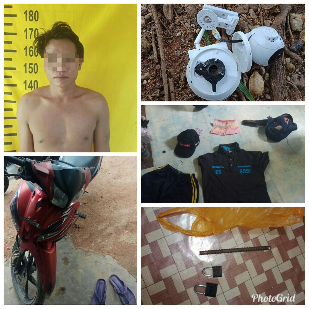 “Barang bukti yang kita amankan berupa Uang Tunai hasil penjualan Rp 1.200.000 ribu rupiah, Sepeda Motor Merk Jupiter Z1 warna Merah tanpa Nomor Polisi, 1 Camera CCTV, Pakaian yang digunakan tersangka saat melakukan aksinya, Topi Warna Hitam, Potongan Besi sepanjang 40cm, Gembok 1 buah dan Tas Slempang 1 buah,” ungkap Kapolsek.