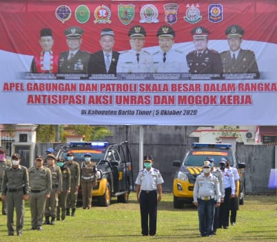 TAMIANG LAYANG – Pemerintah Daerah Kabupaten Barito Timur (Bartim) Provinsi Kalimantan Tengah telah mengadakan apel gabungan dan patroli berskala besar dalam rangka antisipasi aksi unjuk rasa dan mogok kerja bertempat di halaman kantor Bupati Bartim, Senin (05/10/2020).