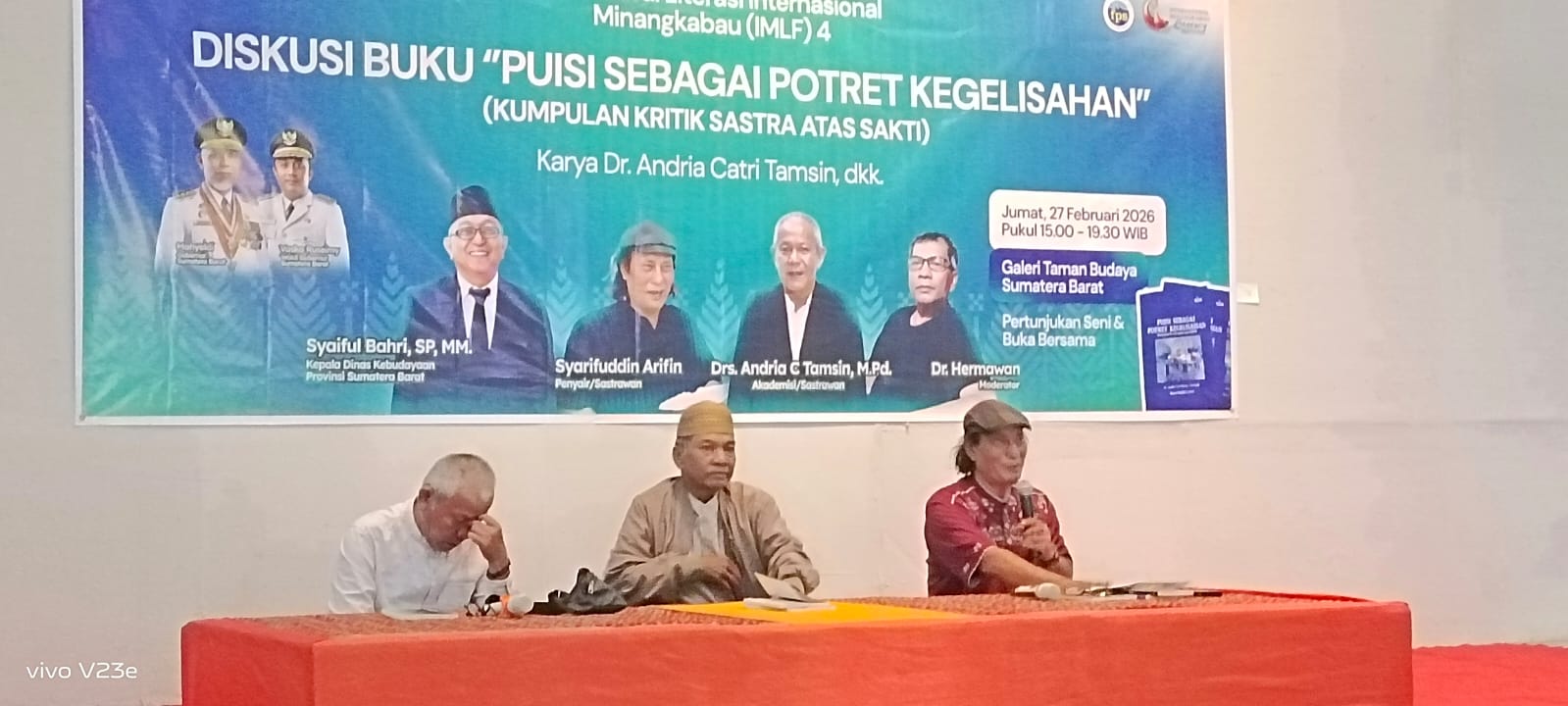 Demikian diungkapkan Kepala Dinas Kebudayan Provinsi Sumatera Barat Syaiful Bahri, SP MM saat membuka Diskusi Buku Buku “Puisi Sebagai Potret Kegelisahan (Kumpulan Kritik Sastra Atas SAKTI) yang ditulis Dr. Andria Catri Tamsin, M.Pd, dkk, di gallery Taman Budaya Sumatera Barat jalan Diponegoro Padang, Jumat (27/2/2026).