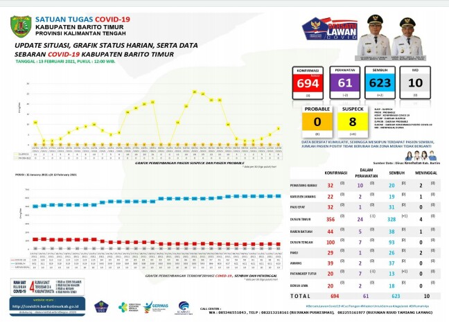 *Adapun jumlah total secara kumulatif kasus Covid-19 di Bartim berjumlah 694 kasus, sedangkan yang dinyatakan sembuh 623 orang, masih dalam perawatan 61 orang, dinyatakan meninggal dunia 10 orang dan Kasus Suspek 8 orang,” ucapnya