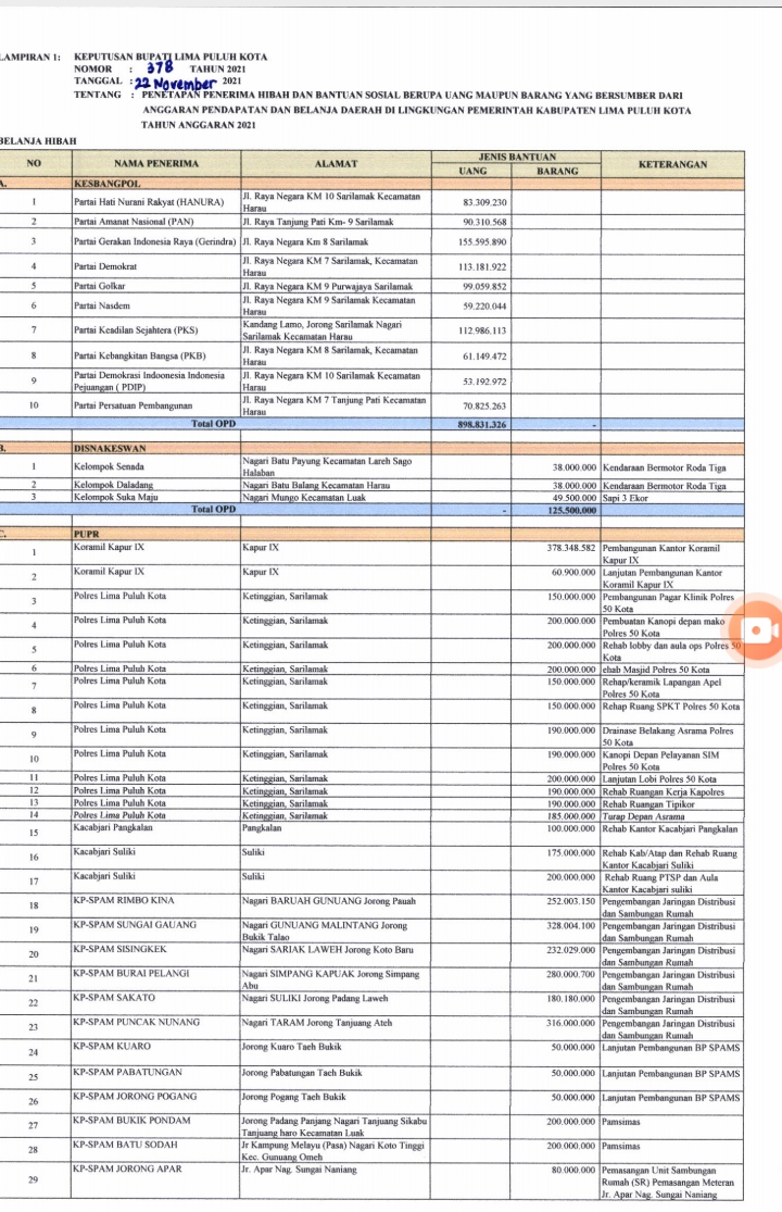 Sepertunya, akhir- akhir ini alokasi APBD 2021, dan berpotensi labrak aturan, Pemkab Limapuluh Kota, kucurkan dana buat 17 paket pembangunan fisik kepada Instansi vertikal ( Polres, Kejaksaan, Dandim ) dengan nilai hampir Rp. 3,2 M, yang terkesan mengkhianati masyarakat Kabupaten Limapuluh Kota.