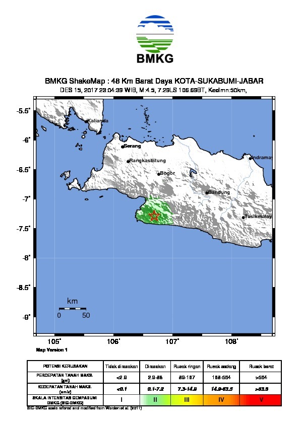 SUKABUMI, harianindonesia.id – Hari Jumat, 15 Desember 2017, gempabumi tektonik mengguncang wilayah Sukabumi. Hasil analisis BMKG menunjukkan bahwa gempabumi terjadi pada pukul 23:04:39 WIB dengan kekuatan M=4.5 Skala Richter dengan episenter terletak pada koordinat 7.29 LS dan 106.69 BT, tepatnya pada jarak 48 Km Barat Daya SUKABUMI-JAWA BARAT pada kedalaman 50 km.